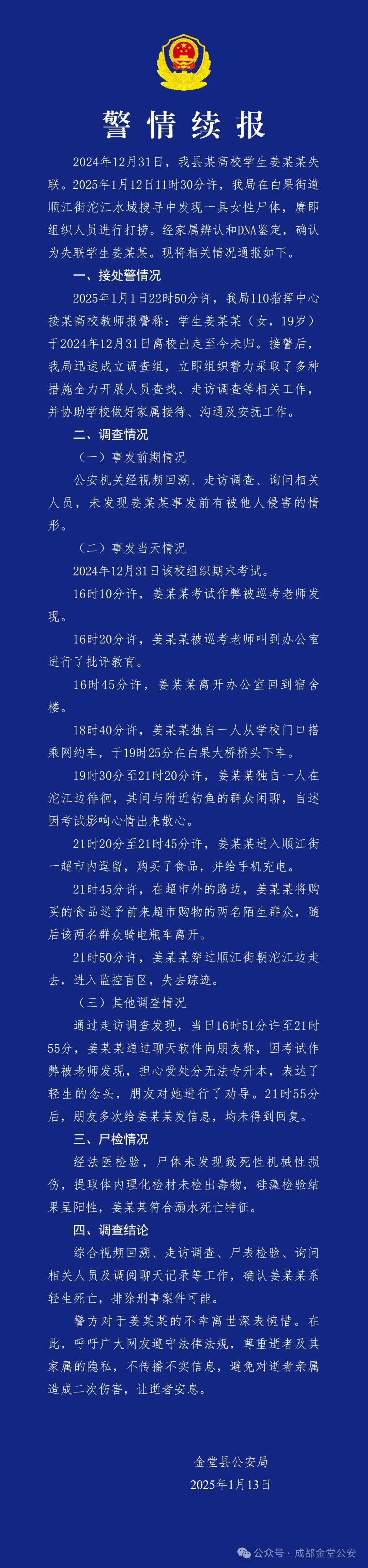 成都警方再通报19岁女大学生失联:系轻生死亡,排除刑案可能