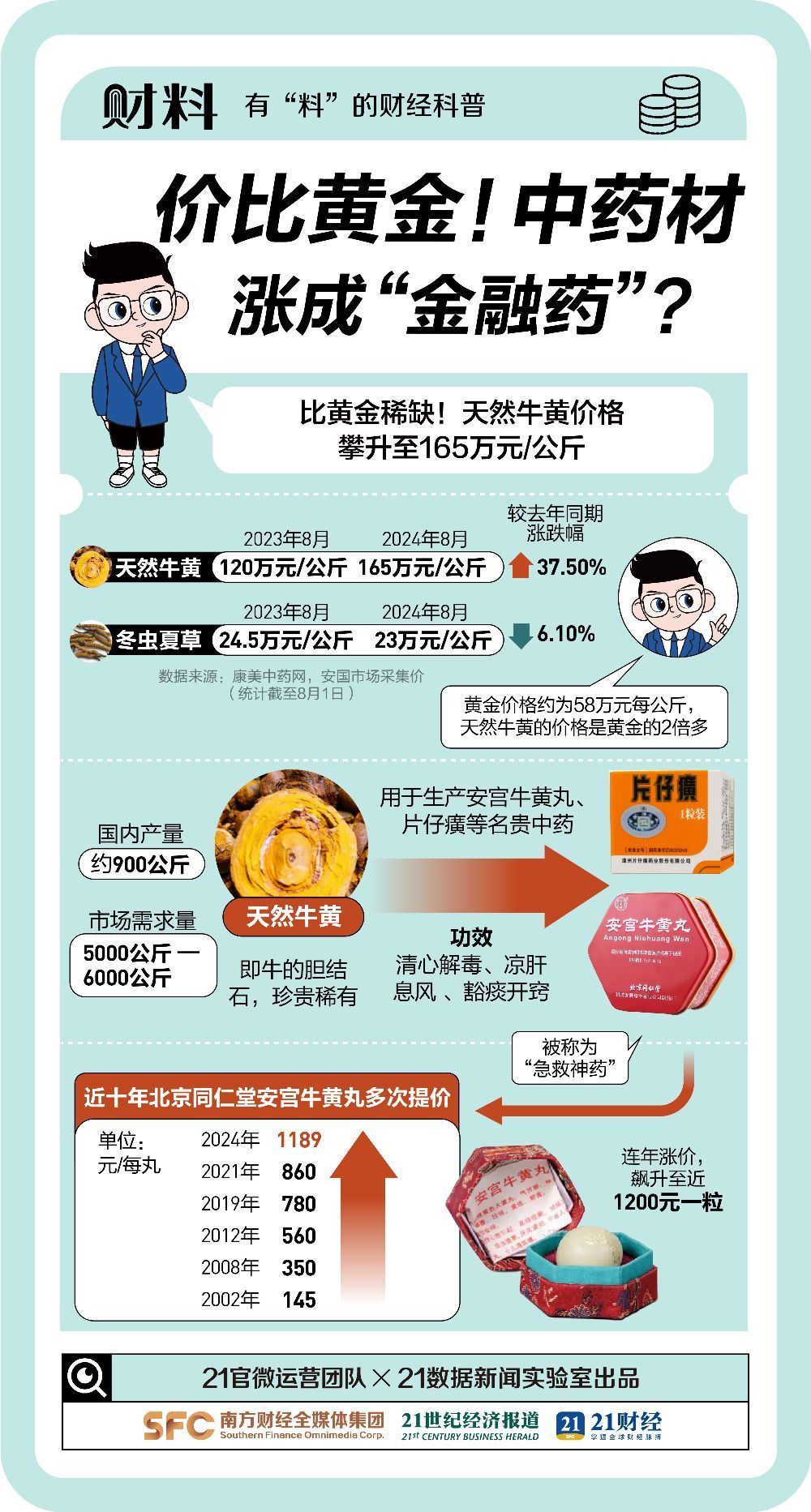 今年以来,天然牛黄、白术、白芍、胡椒等中药材价格一路攀升,有的价格更是涨了几倍。白术去年一公斤37元,现在要180元,商家直呼太离谱,“炒黄金不如炒白术”!天然牛黄已“价比黄金”,却仍然供不应求。每公斤价格攀升至165万元,是黄金价格的2倍多。