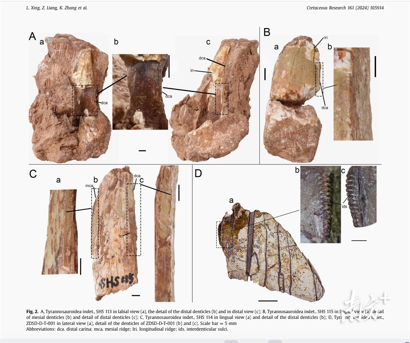 暴龙超科的牙齿为异形齿,不同位置牙齿的大小和形态有一定的区别。本次发现的4枚牙齿在口腔中的具体位置已无法确定,研究团队难以准确估计牙齿所属个体体长。