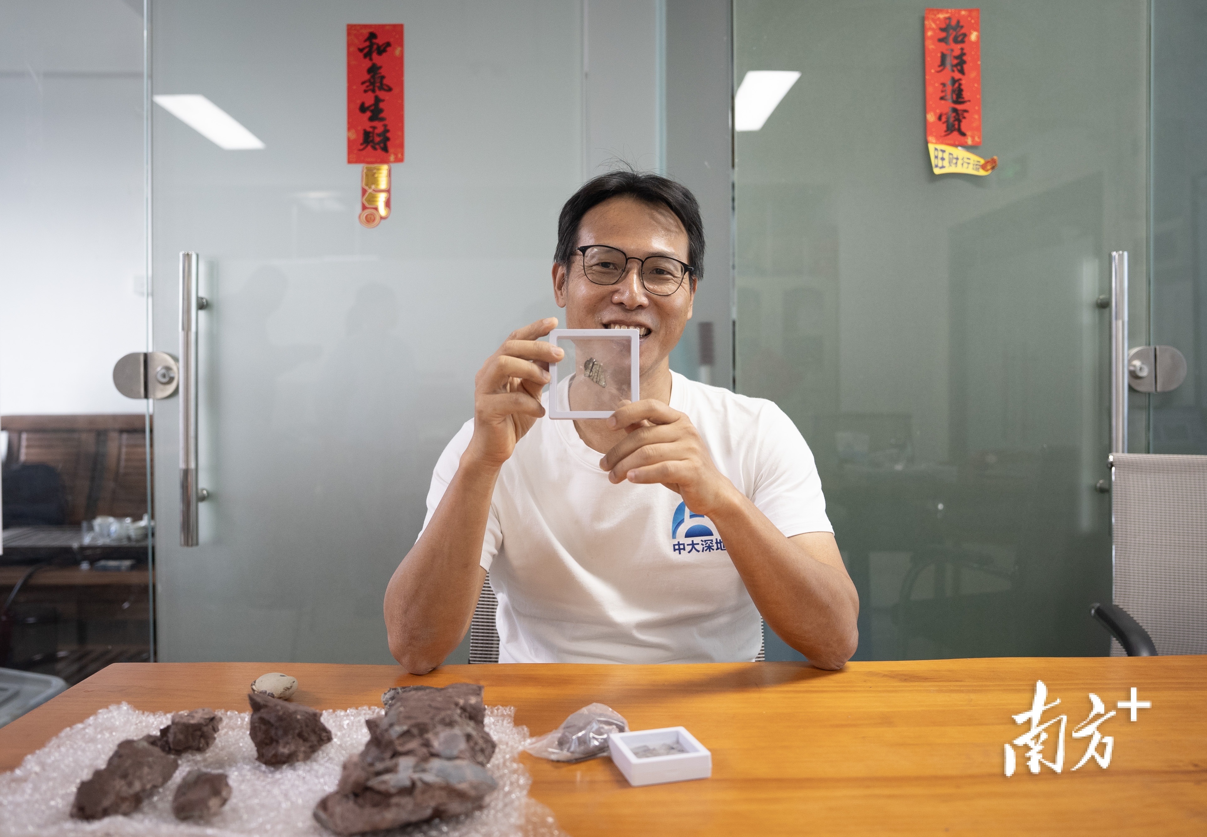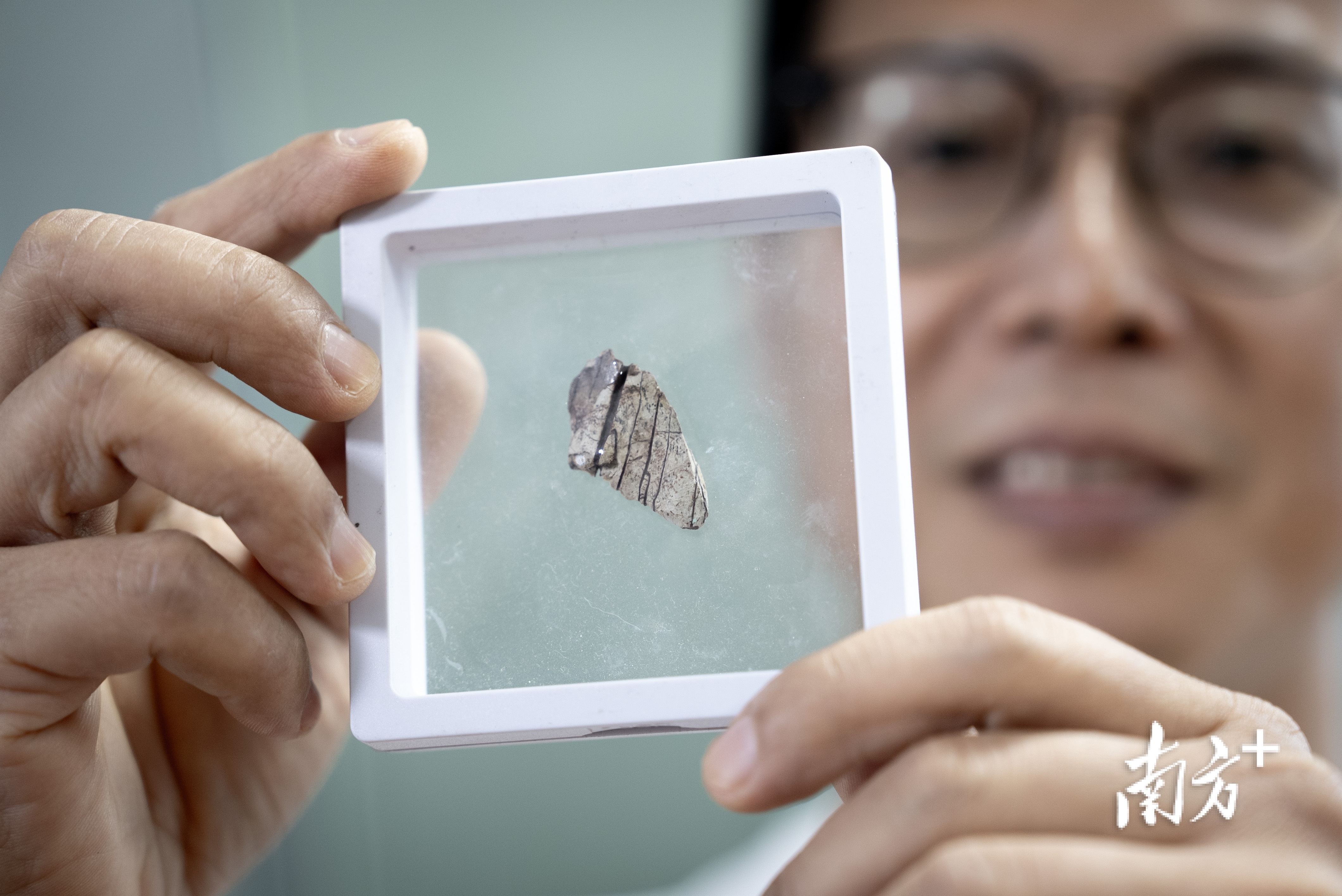 曾强向记者展示该枚发现自广州天河国际金融城的牙齿化石