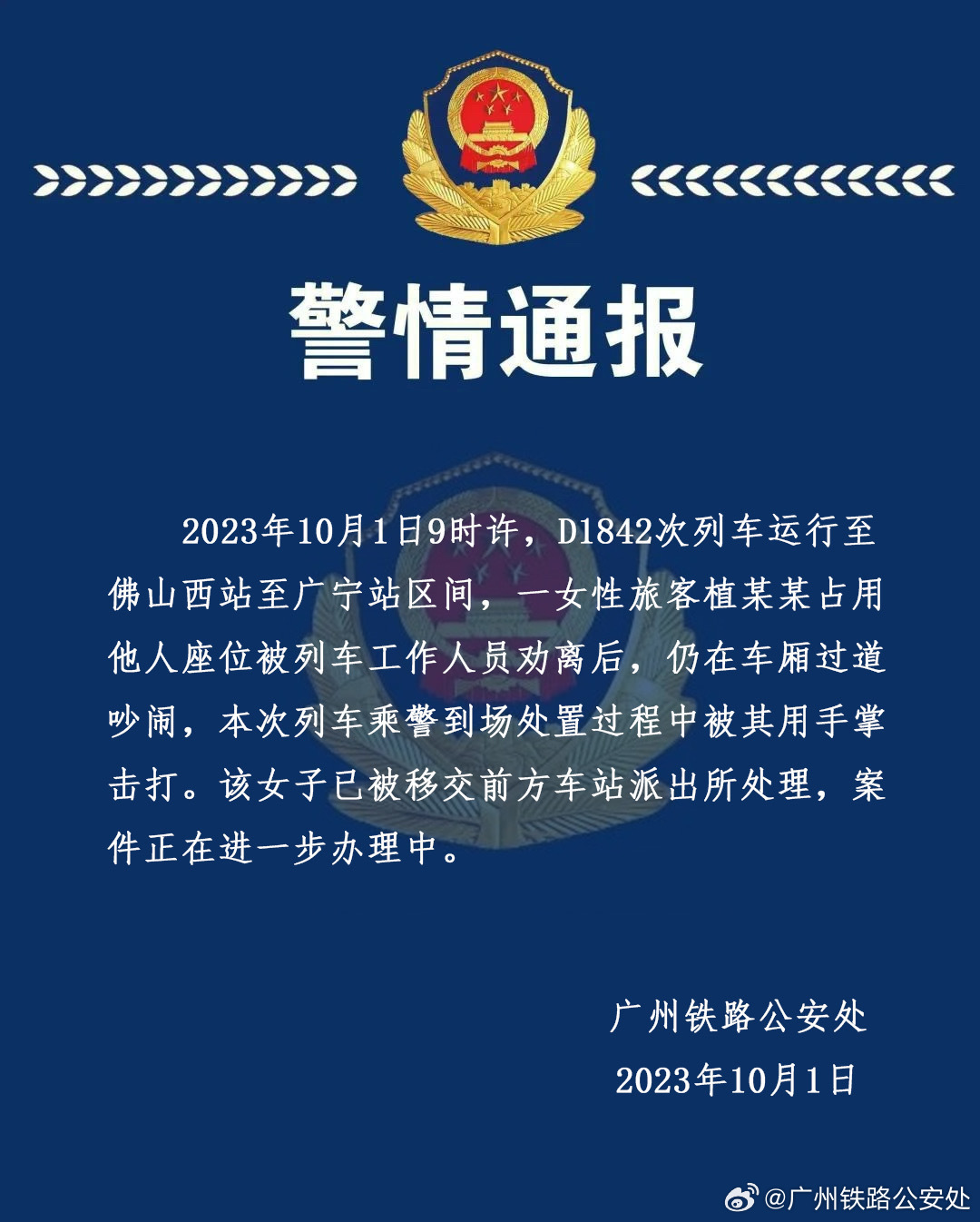 1日晚,@广州铁路公安处 发布通报:D1842次列车运行至佛山西站至广宁站区间,一女性旅客植某某占用他人座位被列车工作人员劝离后,仍在车厢过道吵闹,本次列车乘警到场处置过程中被其用手掌击打。该女子已被移交前方车站派出所处理,案件正在进一步办理中。