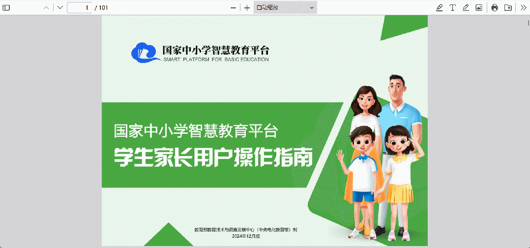 打开国家中小学智慧教育平台首页,点击侧边栏【操作指南】—【学生家长用户操作指南】,即可通过pdf浏览器在线浏览。