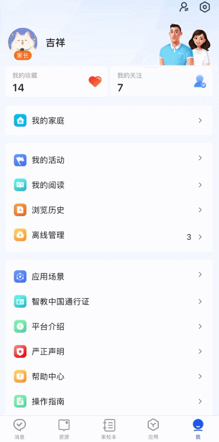 选择【我】—【操作指南】,在列表中选择【学生家长用户操作指南】即可在线浏览。