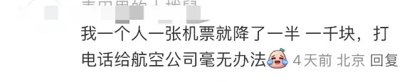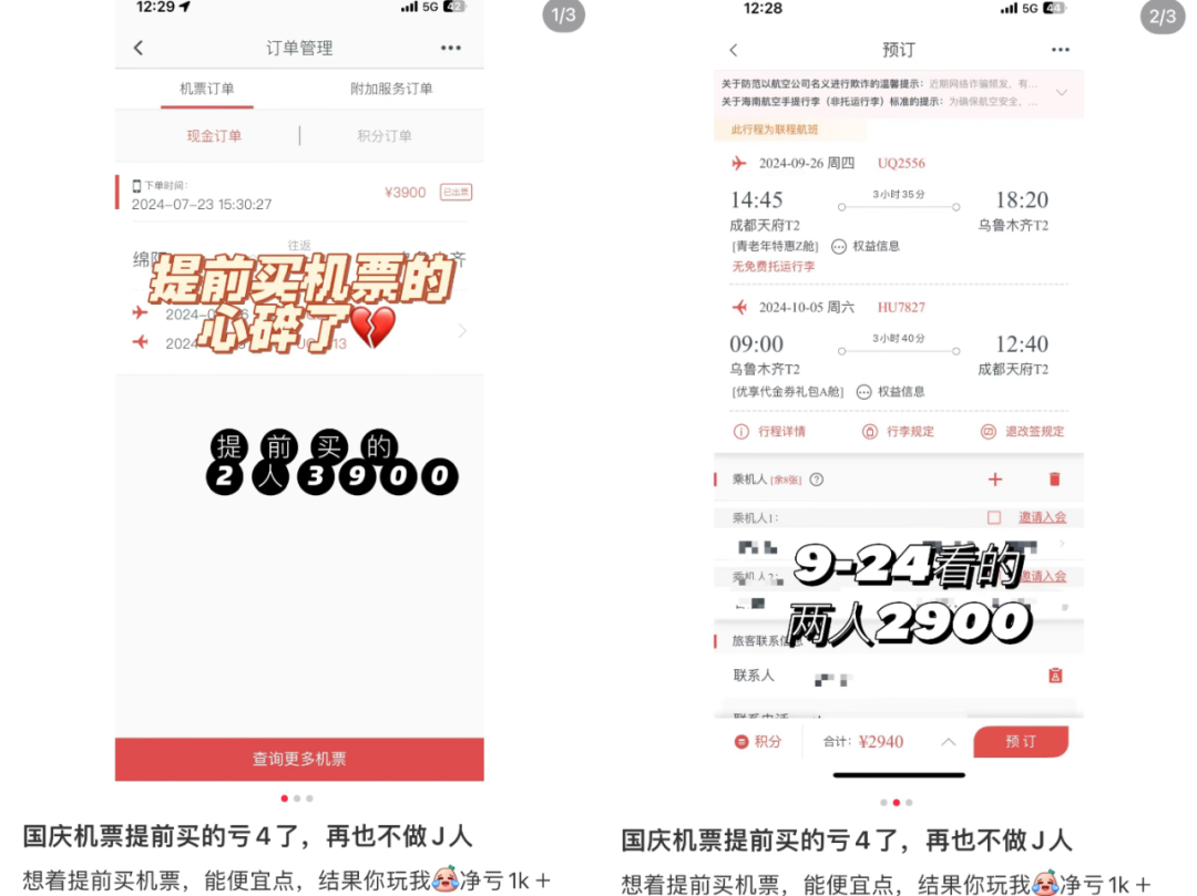 据界面新闻报道,在小红书、微博等社交媒体上看到,不少旅客发帖反馈,提前一两个月下单国庆节机票,结果节前一段时间查看票价,发现价格出现大幅下滑。