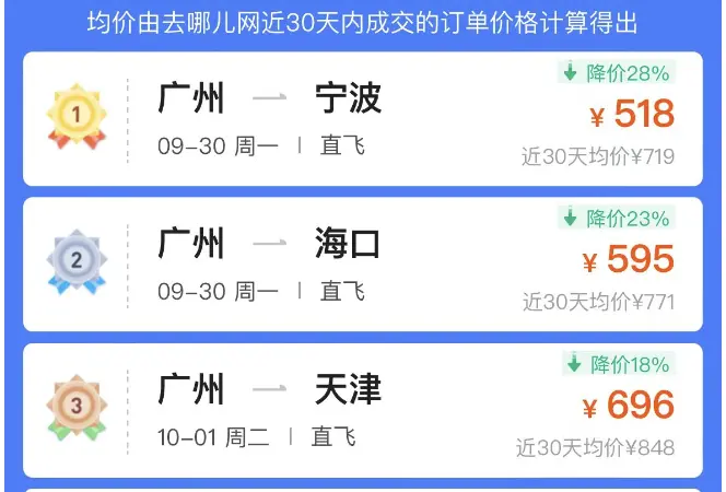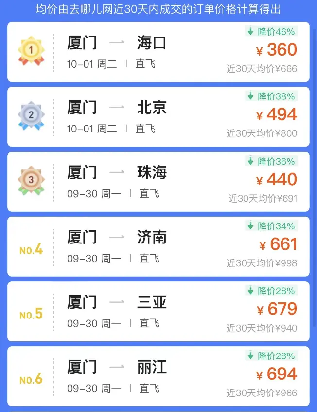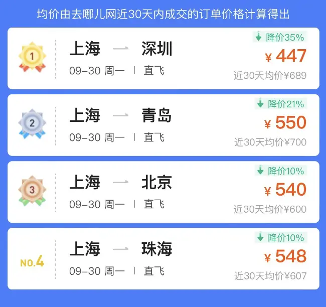 不仅如此,记者查询发现,不少热门城市国庆假期去程机票,都有不同程度的跳水。9月30日从上海出发到深圳、青岛等城市均有不同程度的价格跳水。