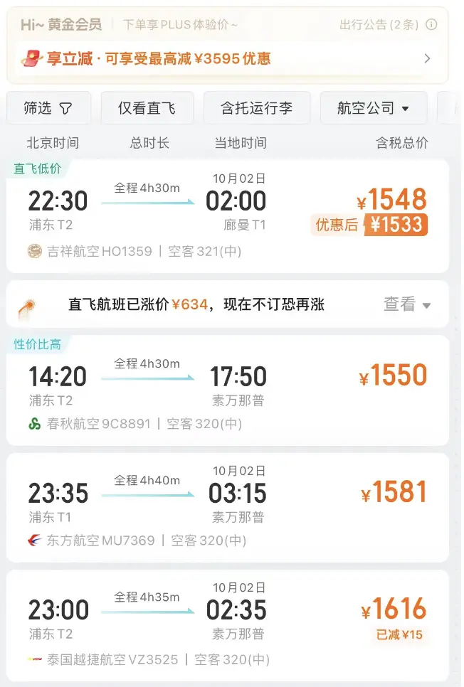 10月1日,上海直飞曼谷,最低裸票价为1548元,相近时间航班在假期后的10月8日,直飞票价为701元,上涨700多元。