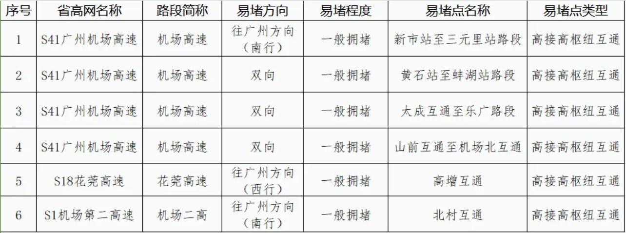 易堵路段。根据广东机场公安预计,今年国庆假期,因出程车流集中释放,机场周边进出城道路、部分桥隧群、高速公路汇合路段、收费站容易形成瓶颈,出现拥堵缓行,预计易堵路段共有6处。