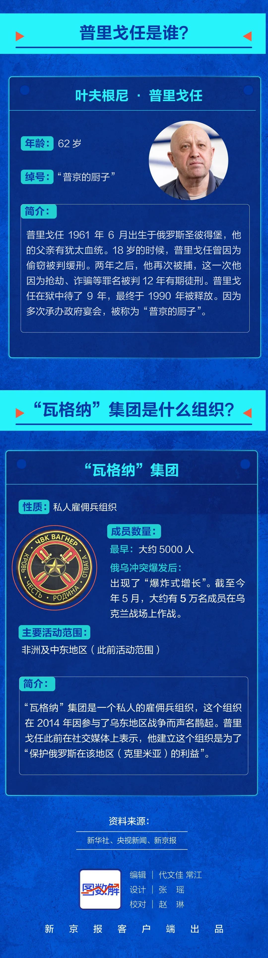 当地时间8月23日,一架私人飞机在俄罗斯特维尔州坠毁致10人死亡,瓦格纳创始人普里戈任遇难,机上人员含瓦格纳集团几乎所有高层。过去的两个月,普里戈任始终是全球焦点人物,从瓦格纳挺进莫斯科到坠机身亡,过去两个月他的一举一动都是媒体追逐的对象,他人生最后的两个月都经历了什么,一图回顾: 编辑 佘余 订阅后可查看全文(剩余80%)