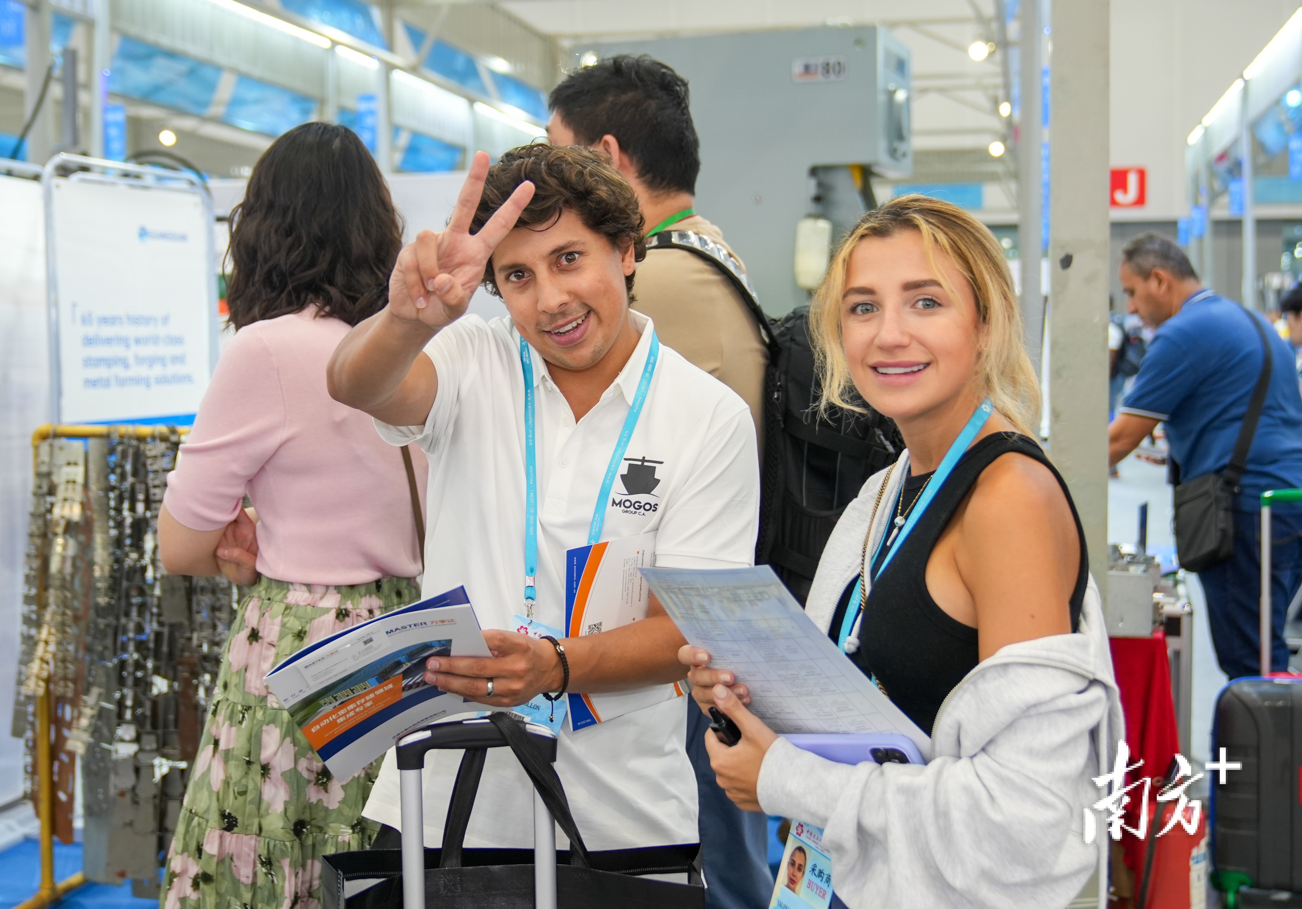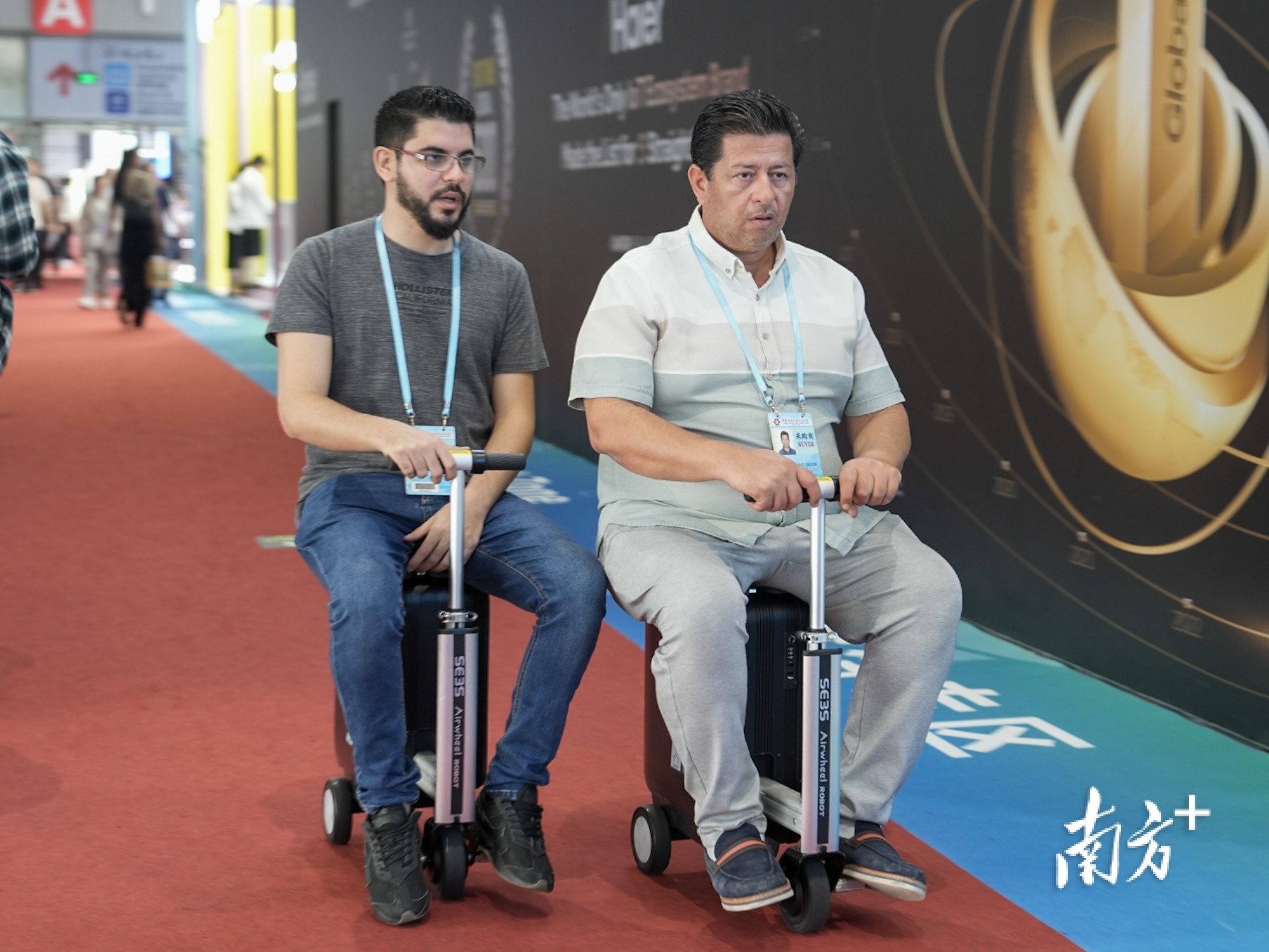 两位境外采购商骑着电动行李箱逛展,电动行李箱被称为广交会现场最实用的逛展装备。南方+记者 张令 摄