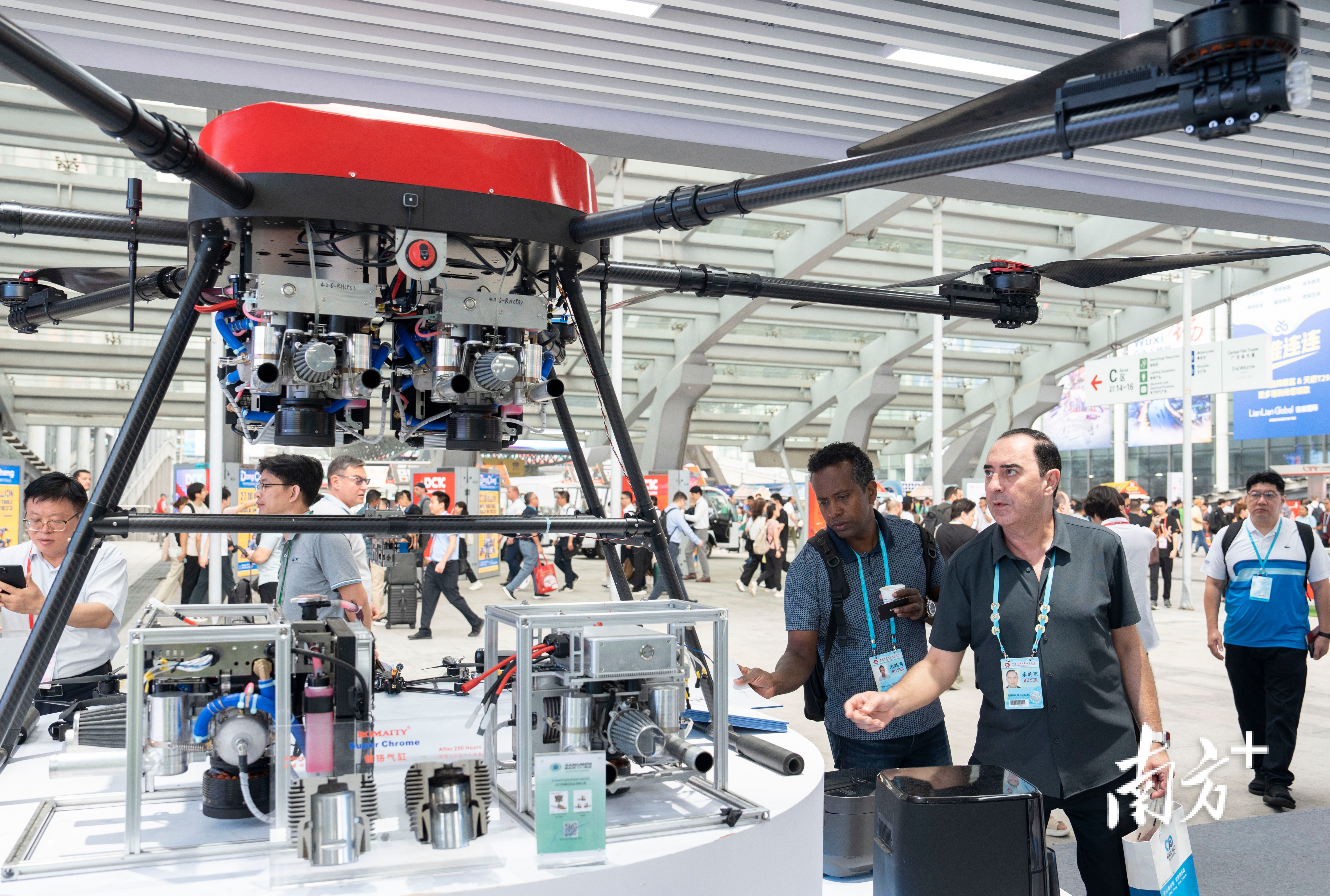 4月18日,在江门企业展位,一款无人机受到境外采购商的关注。南方+记者 张冠军 摄