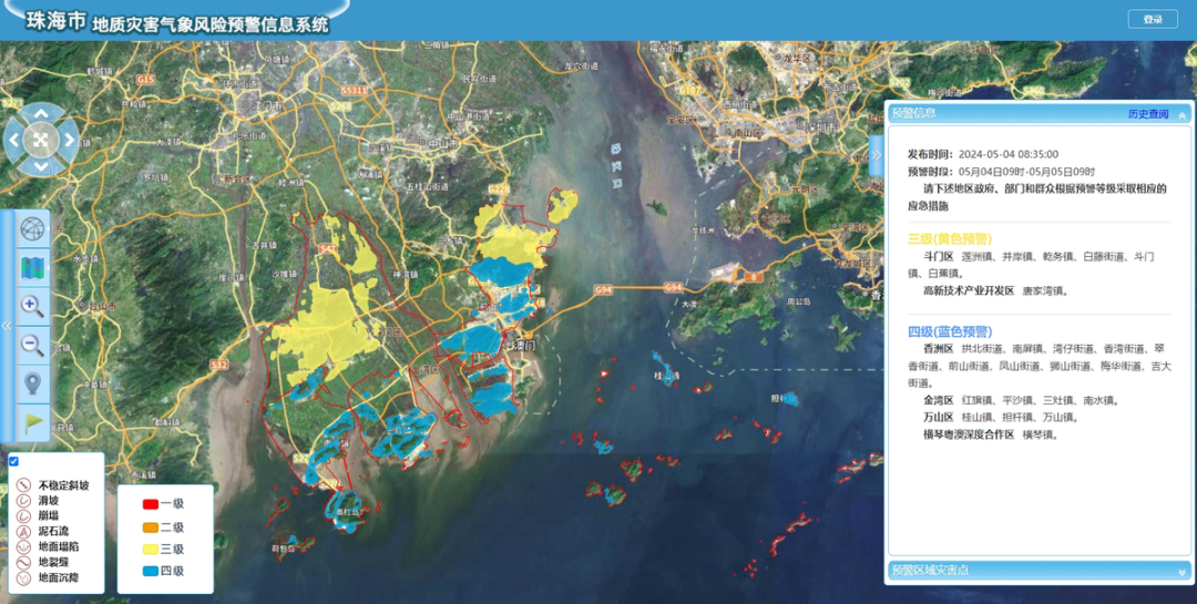 4日上午,受强降雨影响,斗门区莲洲镇、井岸镇、乾务镇、白藤街道、斗门镇、白蕉镇,高新技术产业开发区唐家湾镇地质灾害预警已提升至三级(黄色预警)。相应片区的政府、部门和群众根据预警等级采取相应的应急措施。