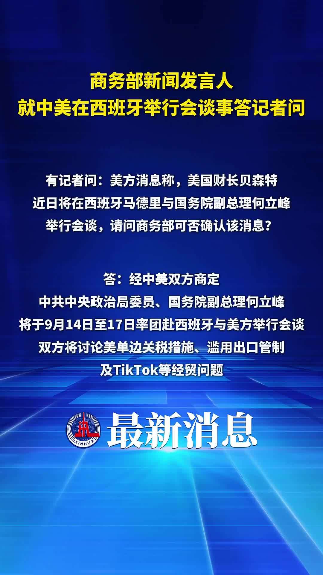 9月12日晚,商务部新闻发言人称,经中美双方商定,中共中央政治局委员、国务院副总理何立峰将于9月14日至17日率团赴西班牙与美方举行会谈。