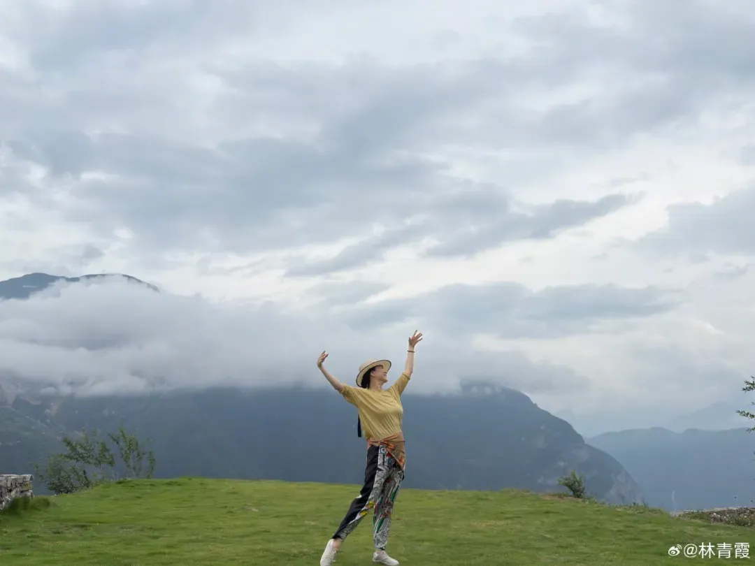 有在巫山旅游时,双臂伸展舞蹈的照片,她配文:除却巫山不是云。