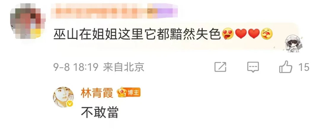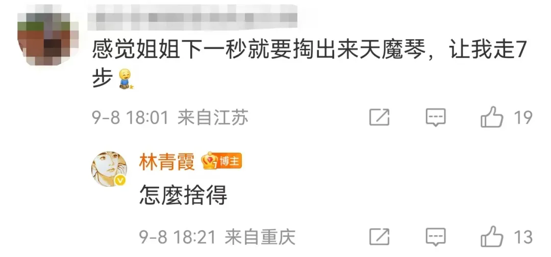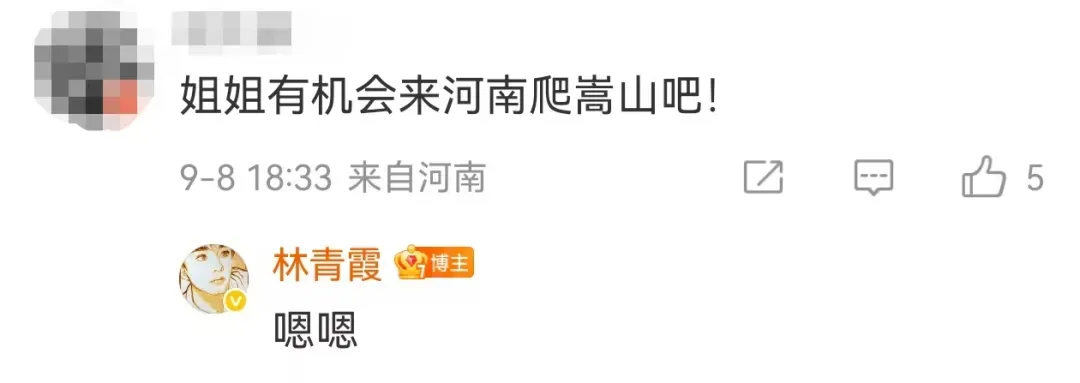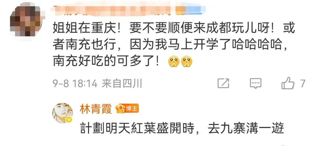 还有不少网友推荐去自己的家乡旅游,林青霞不时用“嗯嗯”回复,她还表示,“计划红叶盛开时,去九寨沟游一趟”。