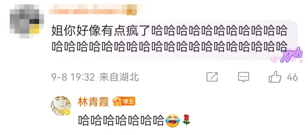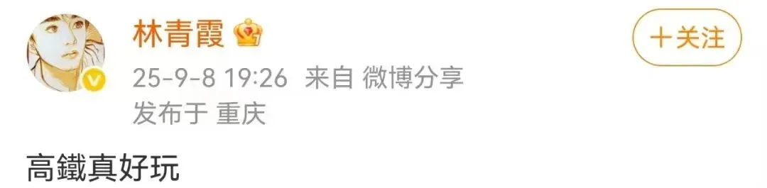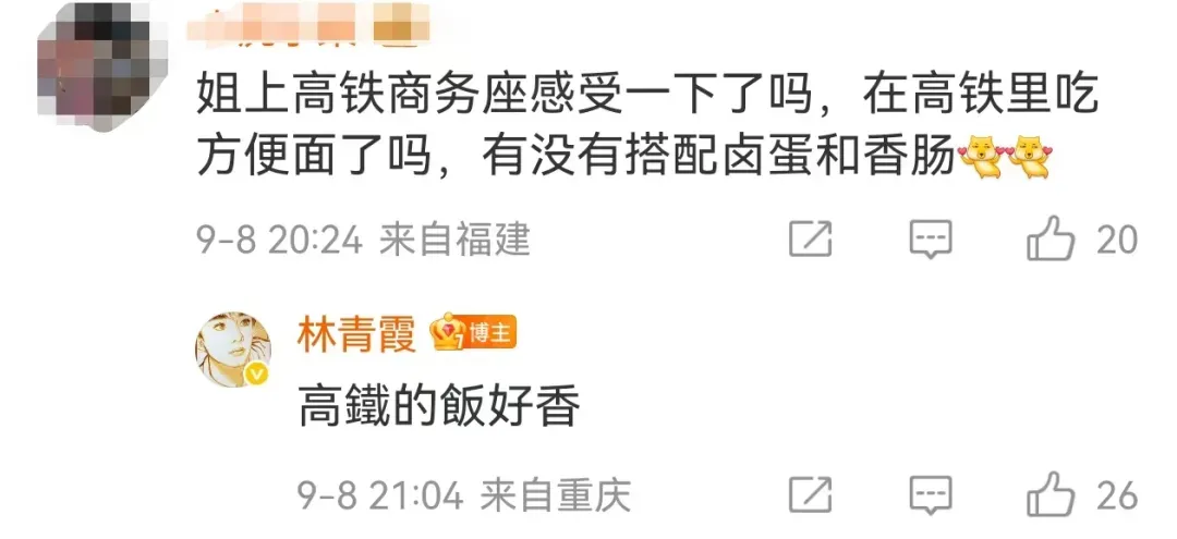有网友问,“高铁里吃方便面了吗?”林青霞答:“高铁的饭好香”。有网友调侃,“姐姐好像有点疯了。”林青霞以“哈哈哈”回复。