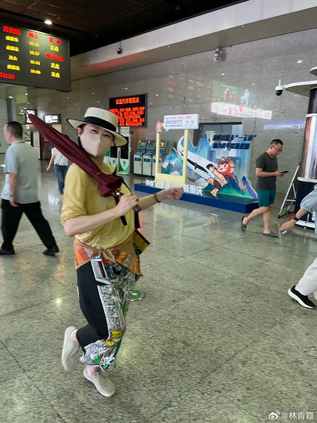 有赶高铁时,背着雨伞踏步走,笑弯了眼的“搞怪照”,她配文:高铁真好玩。