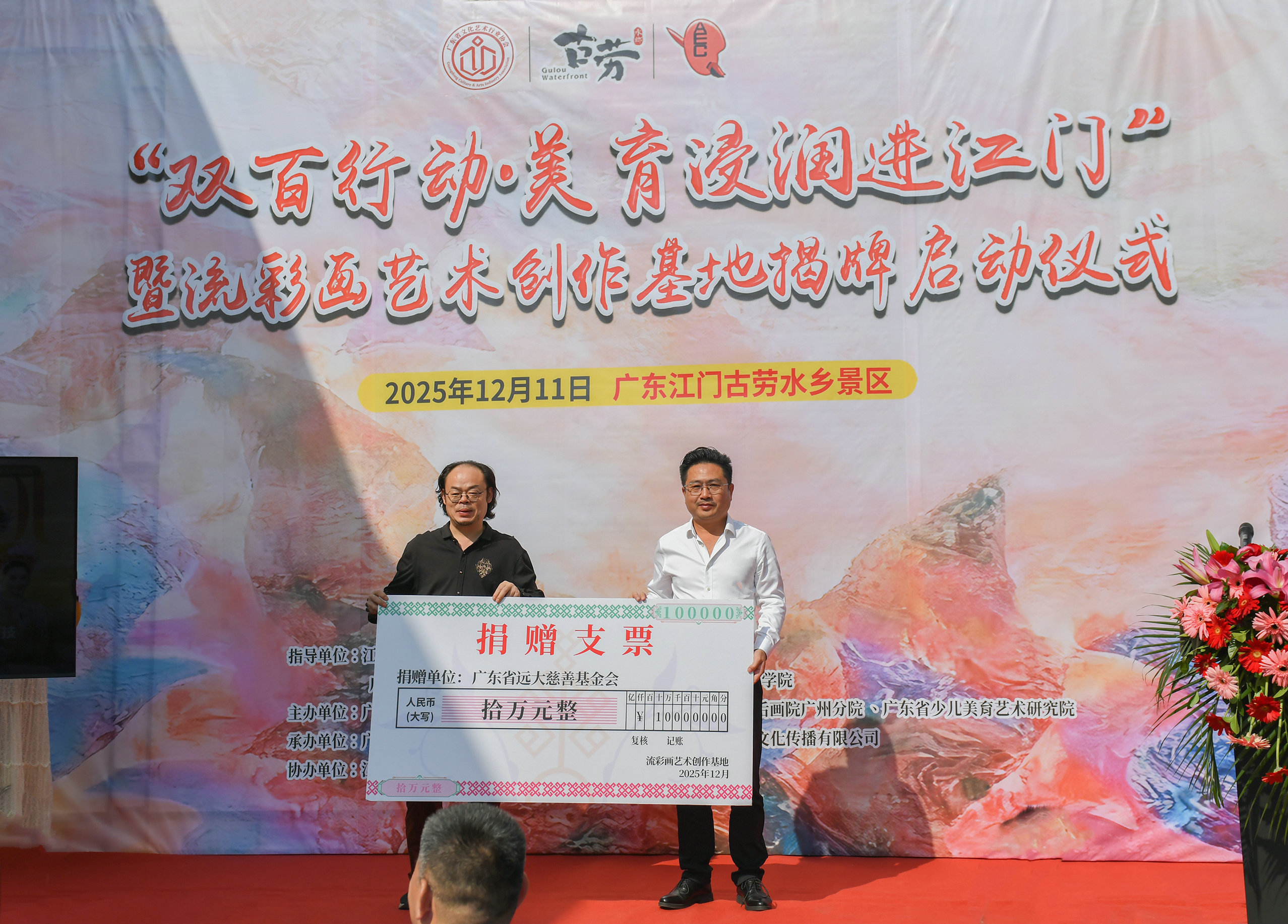 活动现场,江门市文化广电旅游体育局、鹤山市文化广电旅游体育局局长、广东省文化艺术行业协会、广州美术学院城市学院、广东省远大慈善基金会等单位和机构负责人共同为“流彩画艺术创作基地”揭牌。