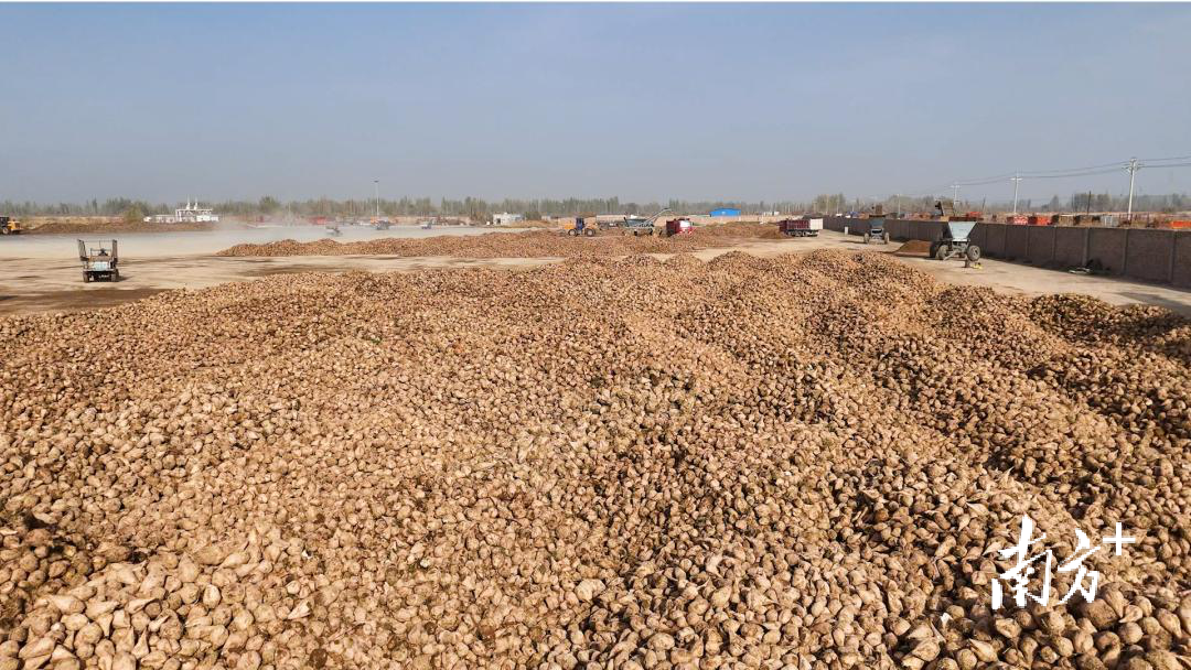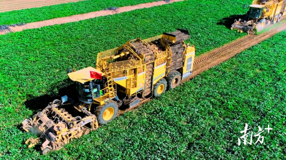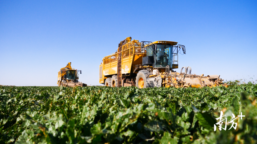 在他的身后,一台大型甜菜收割机穿梭在甜菜地中,机械轰鸣间,饱满壮实的甜菜被连根拔起、自动去叶除泥后,顺着输送装置快速装入运输车辆,即将开启“从田间到工厂”的旅程。
