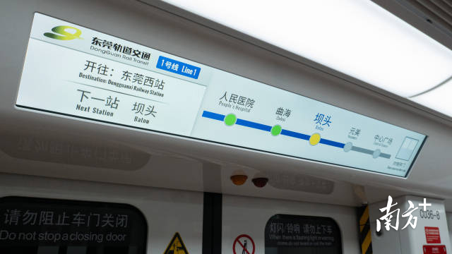 26日当天,很多市民体验了即将开通的1号线。登上列车,大家看到车内座椅、扶手以及运行线路的显示图标都采用蓝色,整个车厢敞亮而通透,科技感十足。从中心广场站到达东莞西站,仅用时大约20分钟,整个过程行驶平稳,车厢内的吊环扶手几乎“纹丝不动”,也没有太大噪音。
