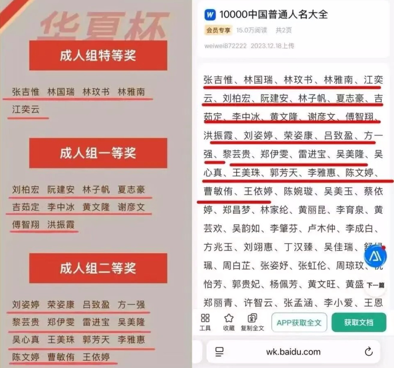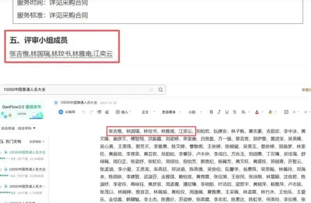 近日,“全网最忙五人组”引发舆论关注。媒体报道,“张吉惟、林国瑞、林玟书、林雅南、江奕云”这五个名字成为“全网最忙”,出现在众多公告、评审、招标、比赛获奖名单上。实际上,这五个名字出自百度文库中的一篇文档《10000中国普通人名大全》。网友戏称,上述五个名字已经成为“老演员”“全网最忙五人组”。