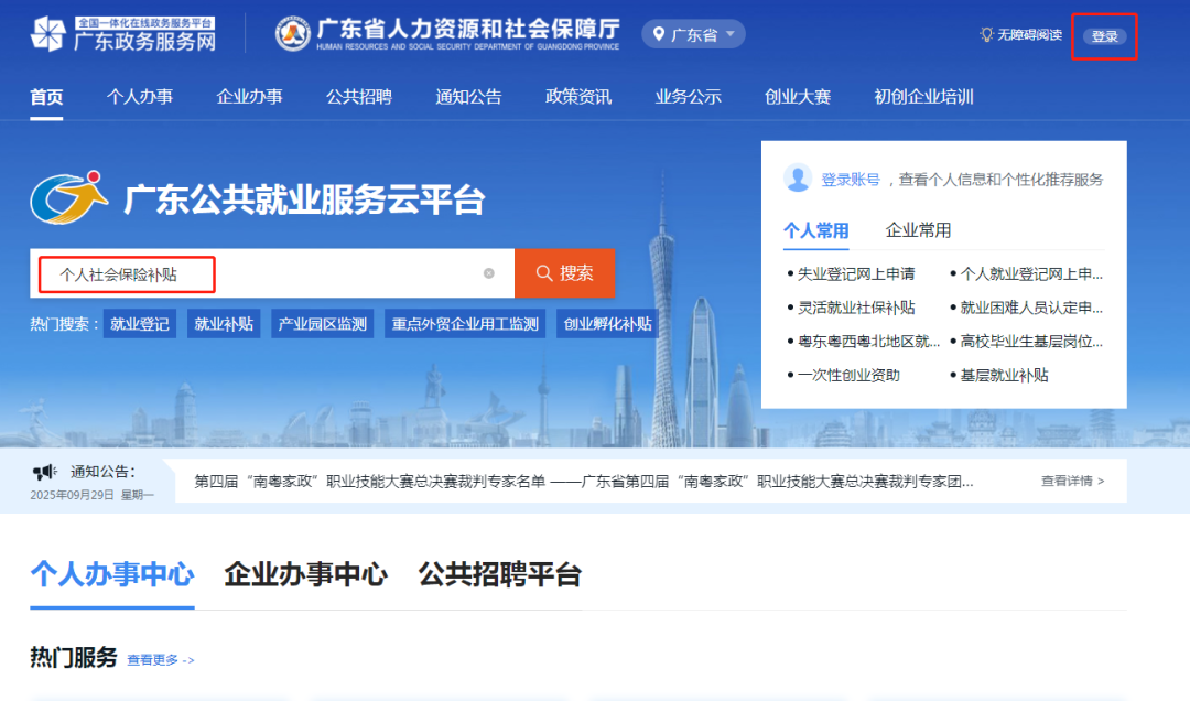 1.搜索“广东公共就业服务云平台”,以“单位登录”方式登录,在搜索框搜索“个人社会保险补贴”。
