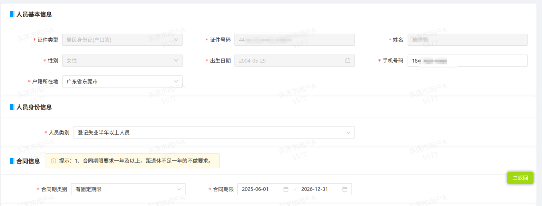 (4)填写合同信息。合同期限要求一年及以上,距退休不足一年的不作要求。