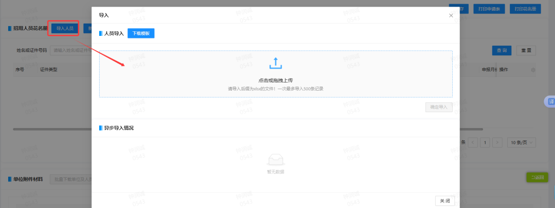 (4)可在下方的异步导入情况,查看导入的进度。点击“查看详情”,可查看导入成功人员和导入失败人员信息。其中,对于失败人员,可点击“导出”,在本地电脑查看失败人员的详情,修改完善后,再按上面的步骤重新导入。