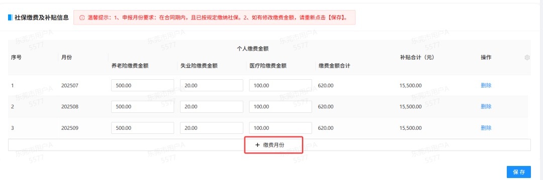 (6)填写社保缴费信息。点击“+缴费月份”,录入申请补贴月份,系统会自动带出养老、失业缴费金额,医保缴费金额需要手动填写,点击“保存”,系统会计算每个月份的补贴金额;如果有修改缴费金额,请务必点击“保存”。根据文件要求,只能申请2025年1月及之后月份的补贴。