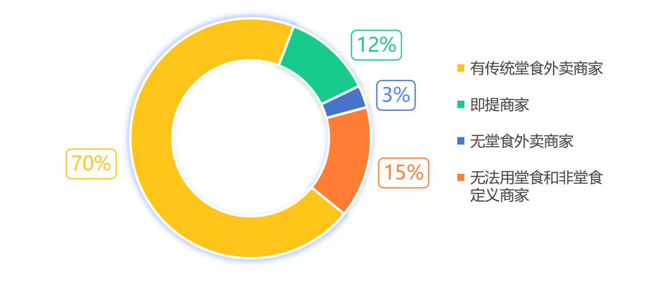 在此分类条件下,调研抽取的美团外卖商家样本显示,无堂食商家占比极小,仅有3%,而拥有传统堂食门店的商家占比达70%,无法用堂食和非堂食定义商家占比15%,即提商家占12%。这一数据说明,餐饮外卖市场中,拥有实体门店的商家是绝对基石,绝大多数外卖订单都来自于后厨环境可被监督的传统餐厅。