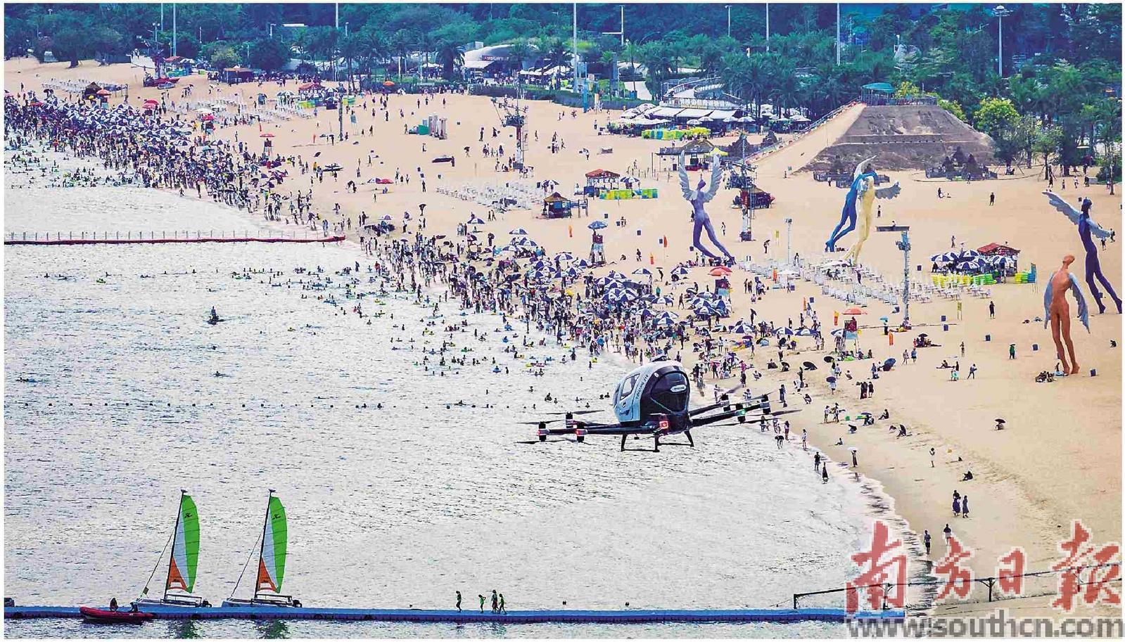 在深圳市盐田区,市民乘坐电动垂直起降航空器(eVTOL),体验低空飞行俯瞰大梅沙片区的海滩景色。
