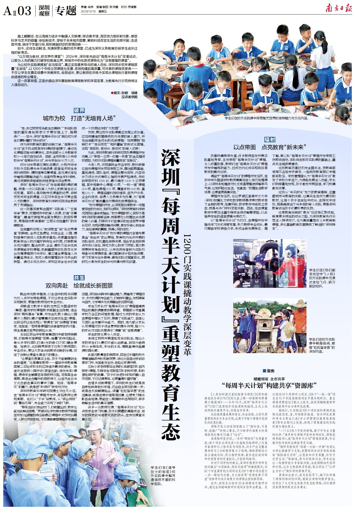 作为深圳教育改革的创新之举,“每周半天计划”在不挤占现有学科课时的前提下,通过优化课程实施与场景转化,率先在部分义务教育学校3—8年级启动试点。目前,全市共有433所学校参与“每周半天计划”,参与学生近60万人次。
