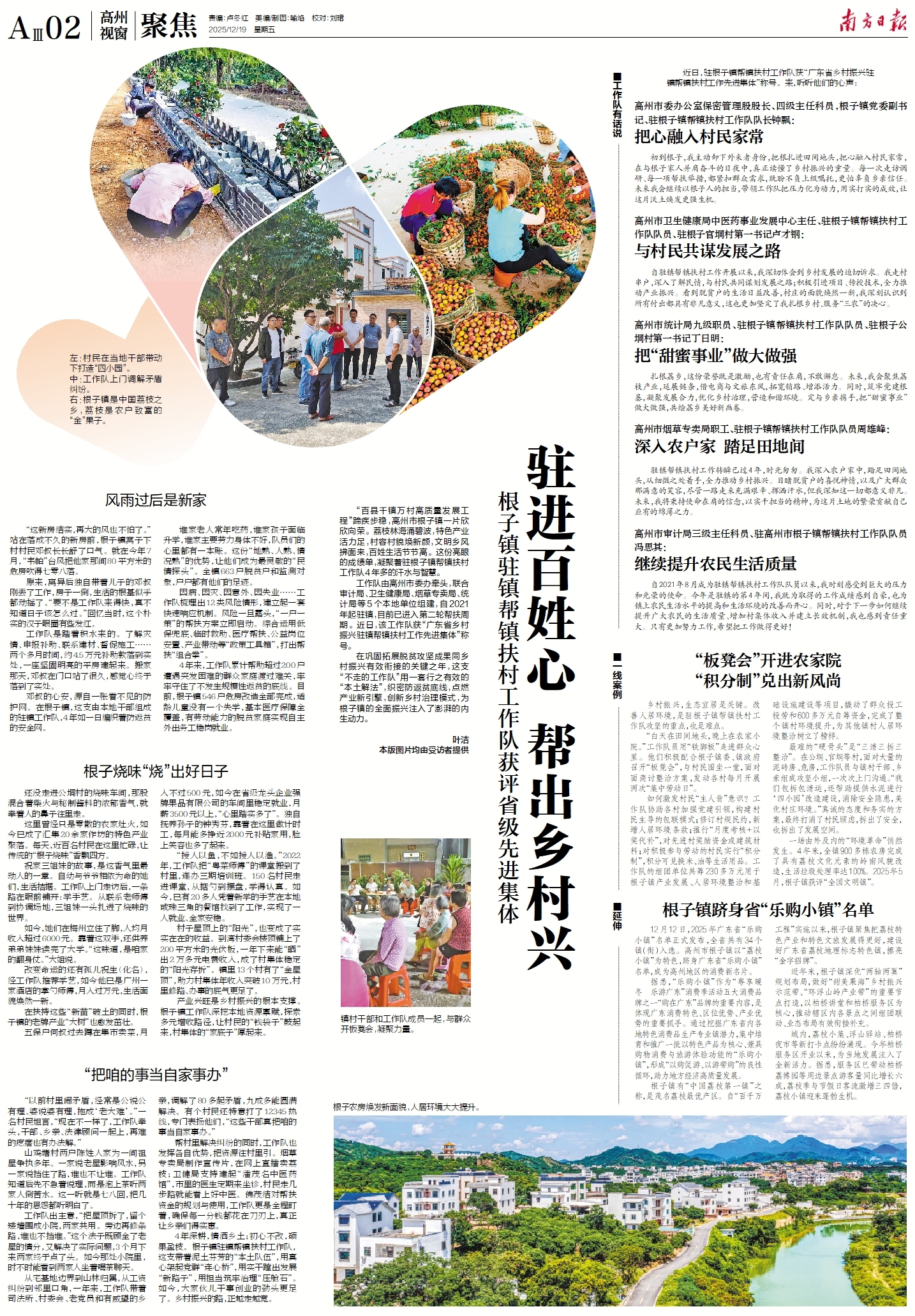 “百县千镇万村高质量发展工程”蹄疾步稳,高州市根子镇荔枝林海涌碧波,特色产业活力足,村容村貌焕新颜,文明乡风拂面来,百姓生活节节高。这份亮眼的“成绩单”,凝聚着驻根子镇帮镇扶村工作队(下称“工作队”)四年多的汗水与智慧。