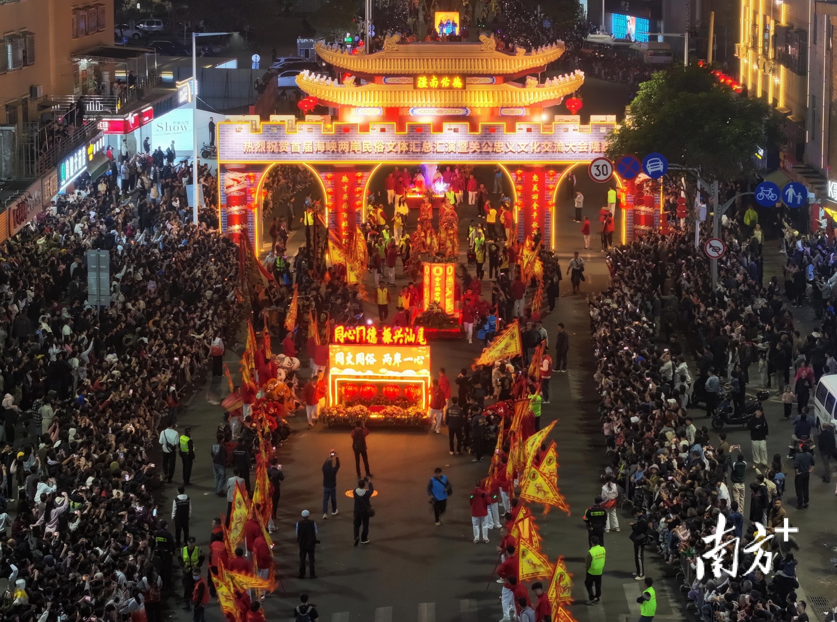 整支巡游队伍宛如一条光彩熠熠的金龙,游动在冬至温暖的滨海夜色中,引来沿途市民阵阵欢呼与热情追随,生动诠释了“同根同文同俗,两岸一家亲”的深厚主题。