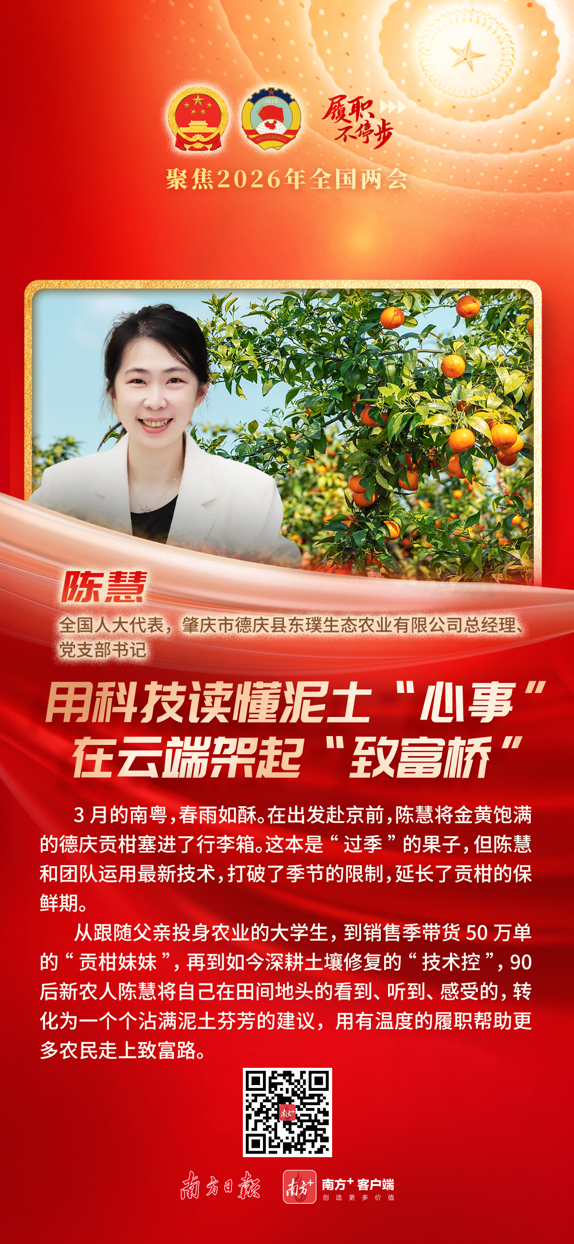 从跟随父亲投身农业的大学生,到销售季带货50万单的“贡柑妹妹”,再到如今深耕土壤修复的“技术控”,“90后”新农人陈慧将自己在田间地头的看到、听到、感受到的,转化为一个个沾满泥土芬芳的建议,用有温度的履职帮助更多农民走上致富路。