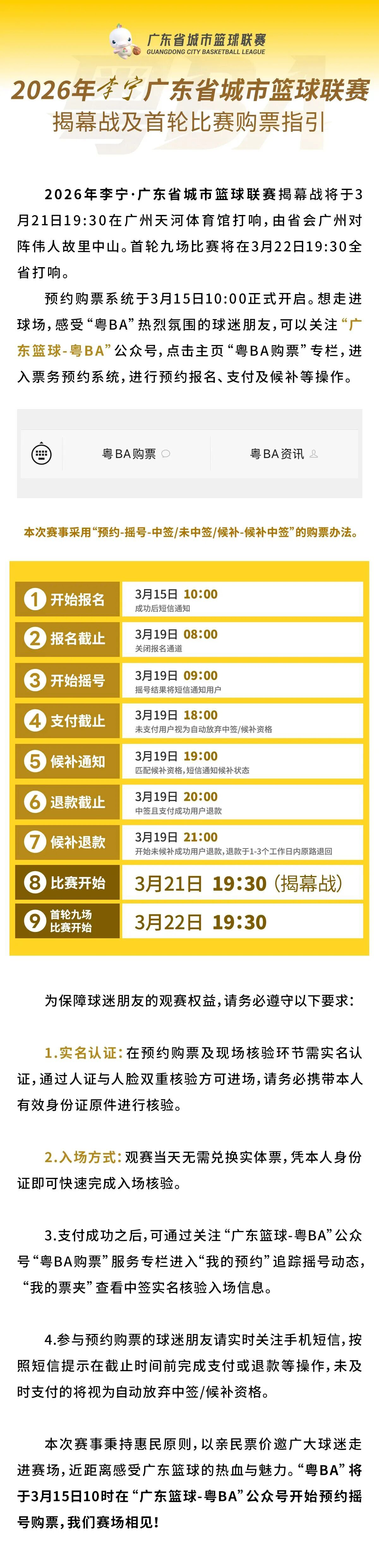 据悉,赛事常规赛阶段的票价以惠民为本,最低价仅8.8元。其中,“粤BA”票价分为8.8元和18.8元两档,“粤超”票价全场统一8.8元。“粤BA”将于3月15日10时在“广东篮球-粤BA”公众号开始预约摇号购票。