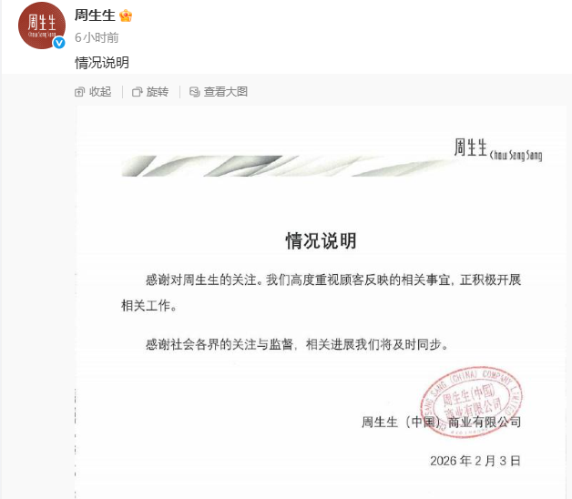 针对此事,2月3日,周生生官方微博发布情况说明:“我们高度重视顾客反映的相关事宜,正积极开展相关工作。感谢社会各界的关注与监督,相关进展我们将及时同步。”