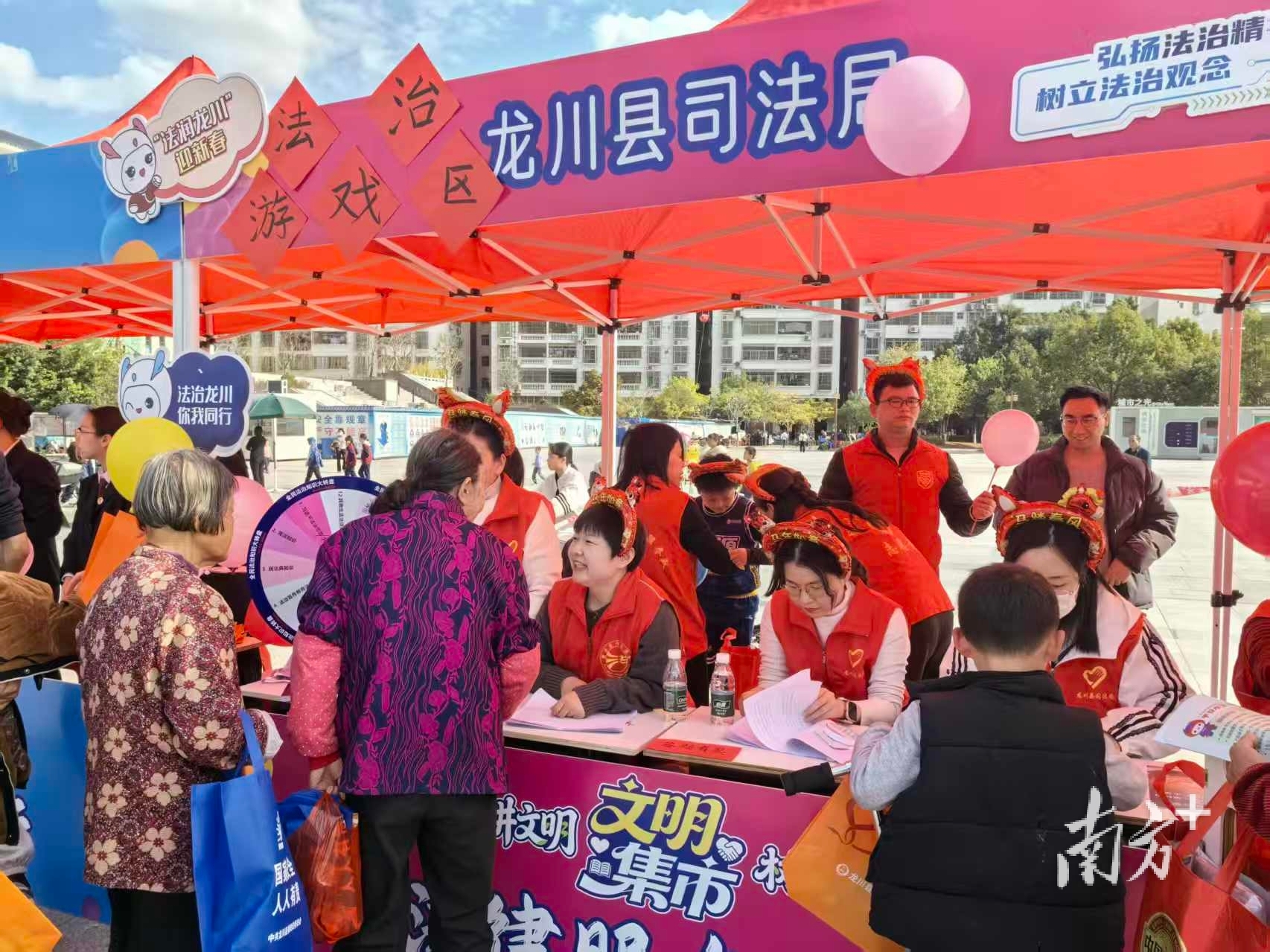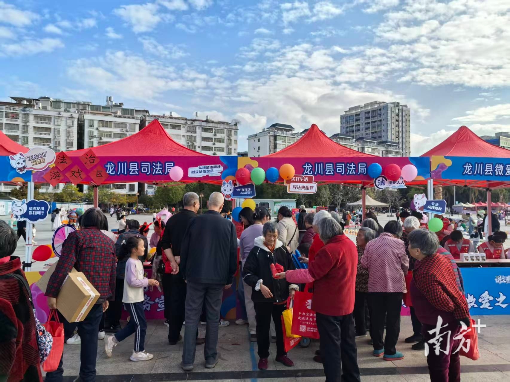 龙川县司法局、县普法办、县法援处通过依托“龙川县文明集市”和文旅新地标,创新设置了法律咨询台与互动游戏区。“法治转盘”有奖问答、“法治拼图”等环节寓教于乐,普法志愿者针对不同群体“量体裁衣”:针对长辈宣讲反诈知识,针对青少年融入“小珑小川”动漫素材讲解未成年人保护法。