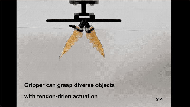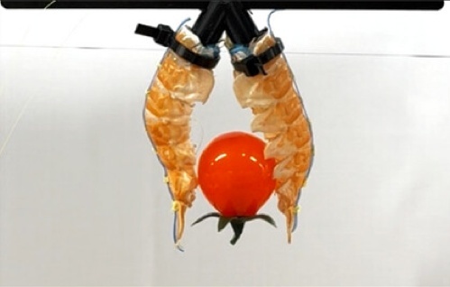 如果把两个大小差不多的死龙虾组合起来、肚子对着肚子,再给两侧施加同样大小的力,这对死龙虾机器人就能通过团身,变成电动抓夹,不管是滑溜溜圆滚滚的番茄、樱桃,还是方正的木块,都能牢牢抓住。