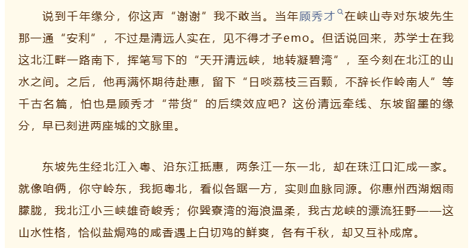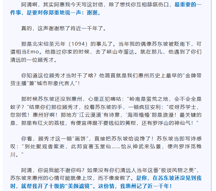 惠州在信中写到:如果没有你们清远人顾秀才的一顿疯狂安利,苏东坡来惠州的心情可能就像上坟,而不像度假了。