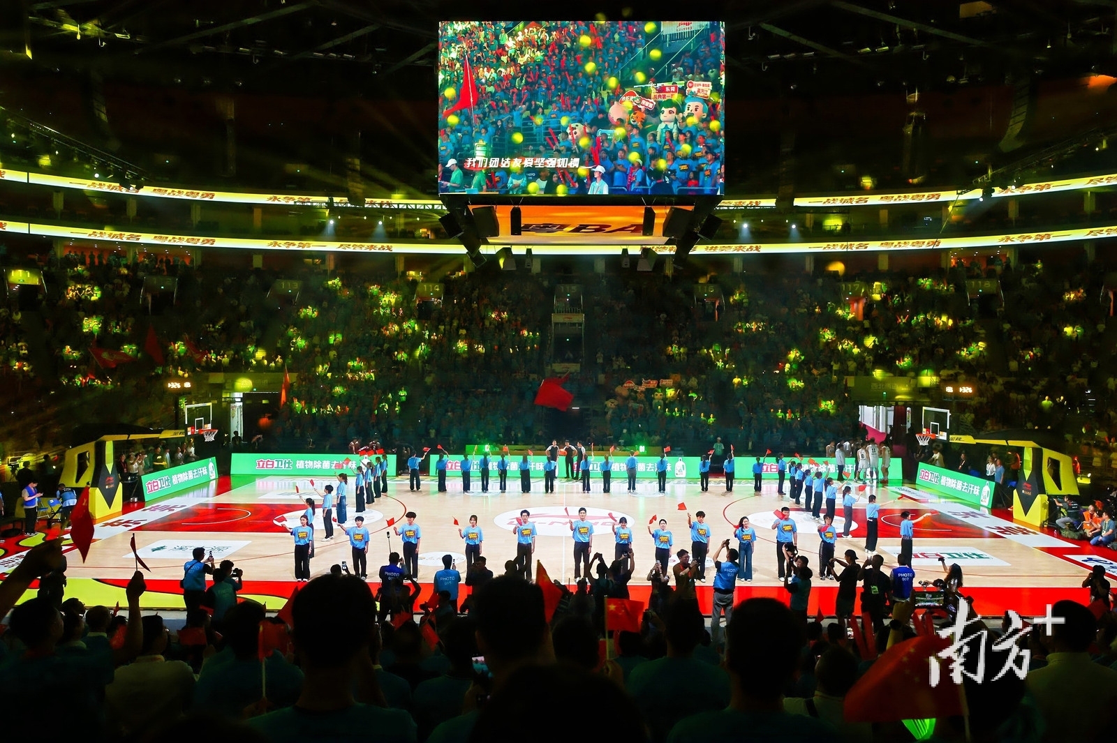 比赛中场,东莞篮球中心了一首所有人都刻在骨子里的旋律——《歌唱祖国》。