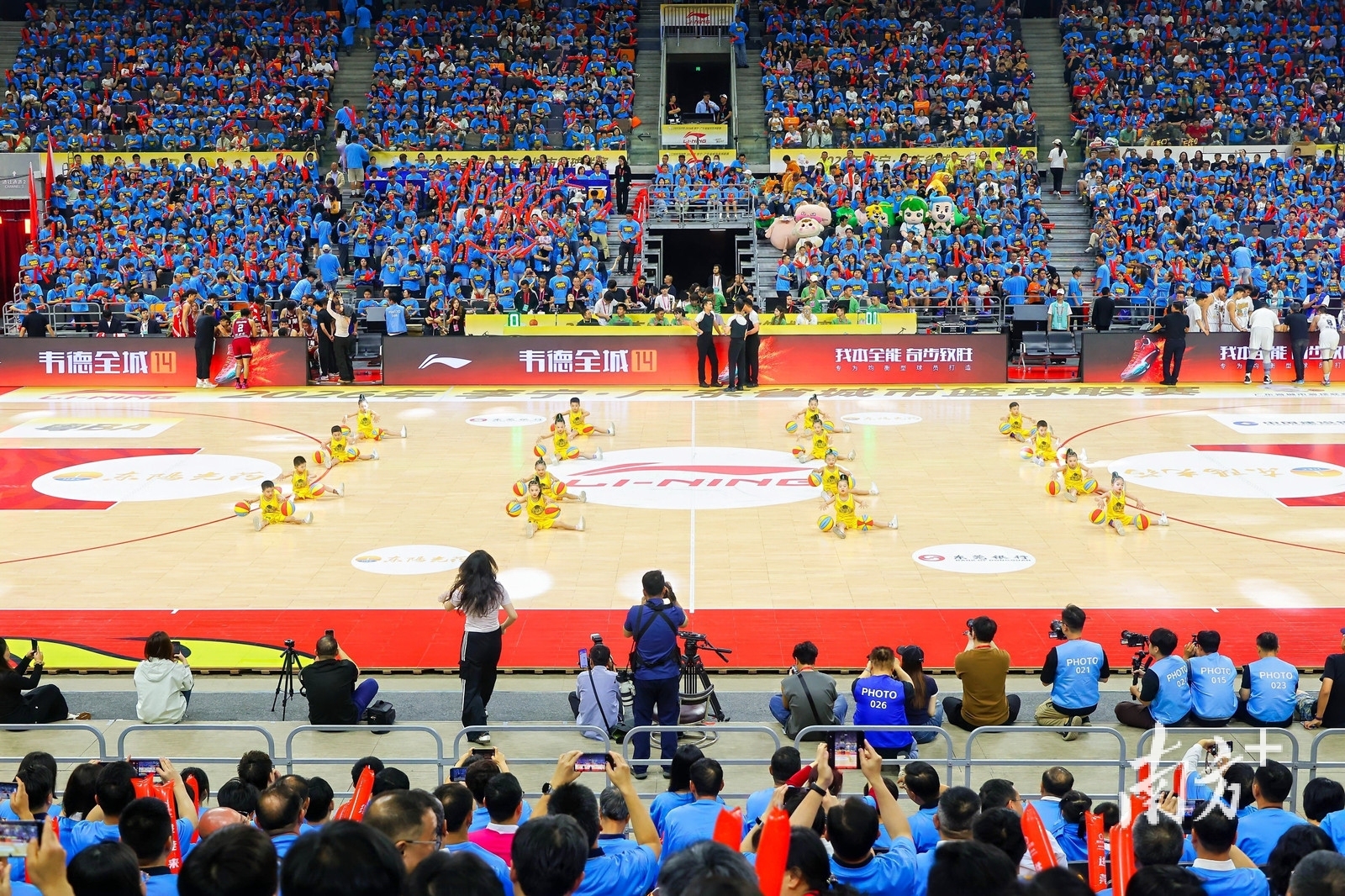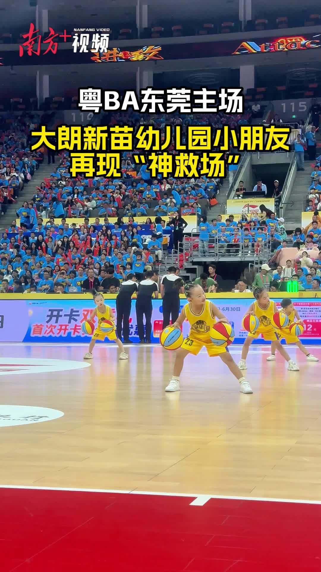 第一节节间休息,大朗镇新苗幼儿园小朋友带来啦啦操——《童趣篮球》表演。他们最小的只有四五岁,最大的也不过七八岁。穿着迷你版的球衣,步伐稚嫩,表情却格外认真。
