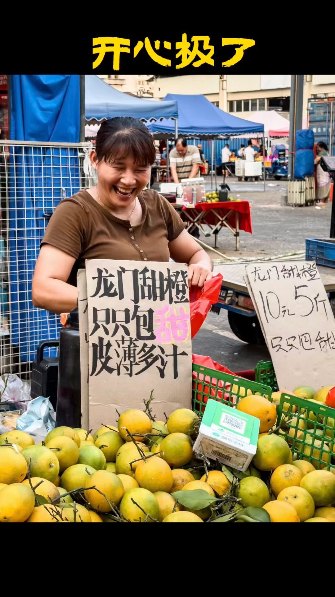 把市场逛了一圈后,他走向一个卖橙子的摊位,先买了三斤橙子,当作开口的由头。摊主阿姨不明就里,但还是很快找来一张空纸板递给他。 他照着原招牌抄下“龙门甜橙 只只包甜 皮薄多汁”十二个字,把“甜”字用粉色填满,再用亮黄色勾边,“薄”特意收细线条,“汁”的三点水画得饱满,像真的要往下坠。随着字一个个逐渐成形,阿姨的眼神也亮了起来。