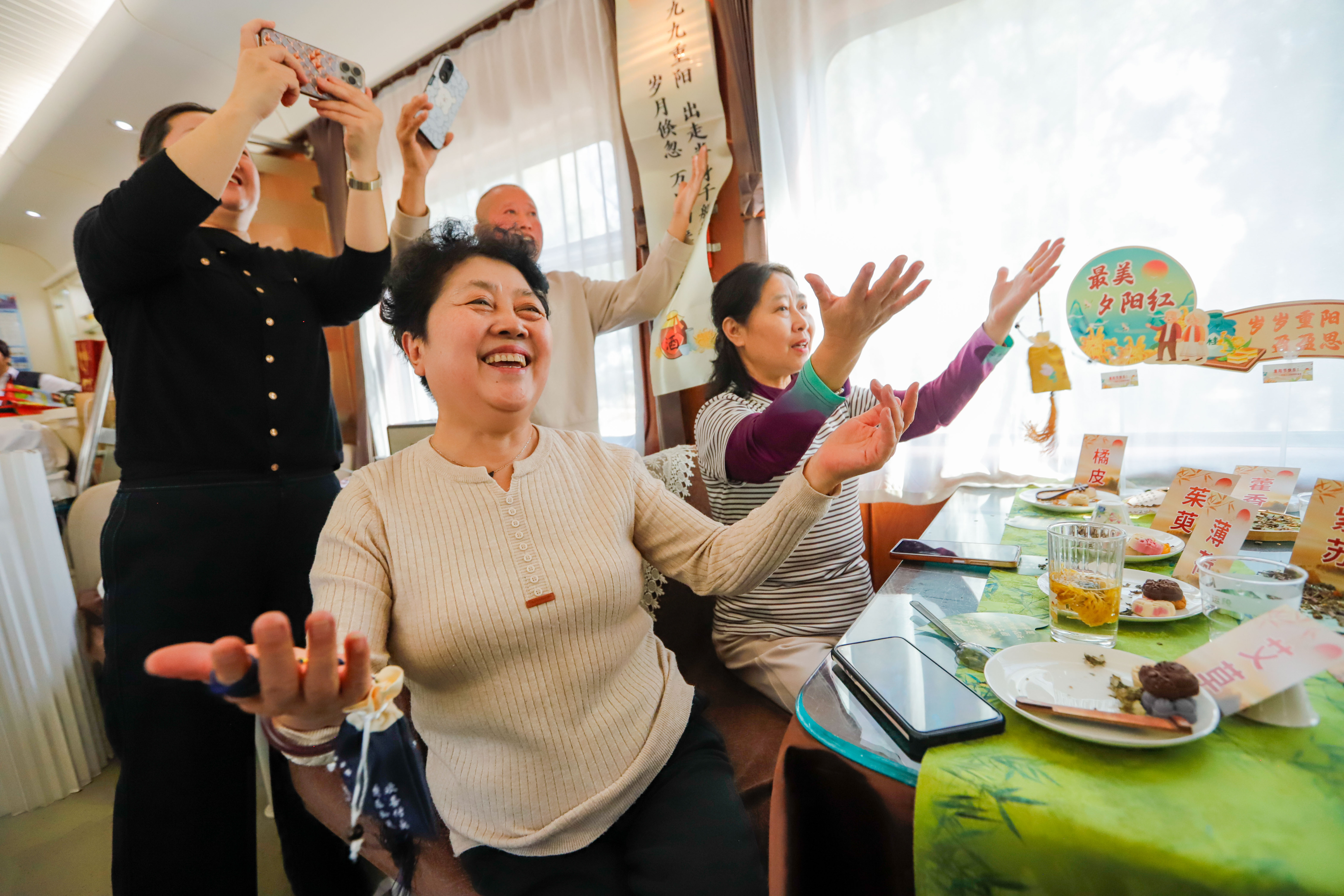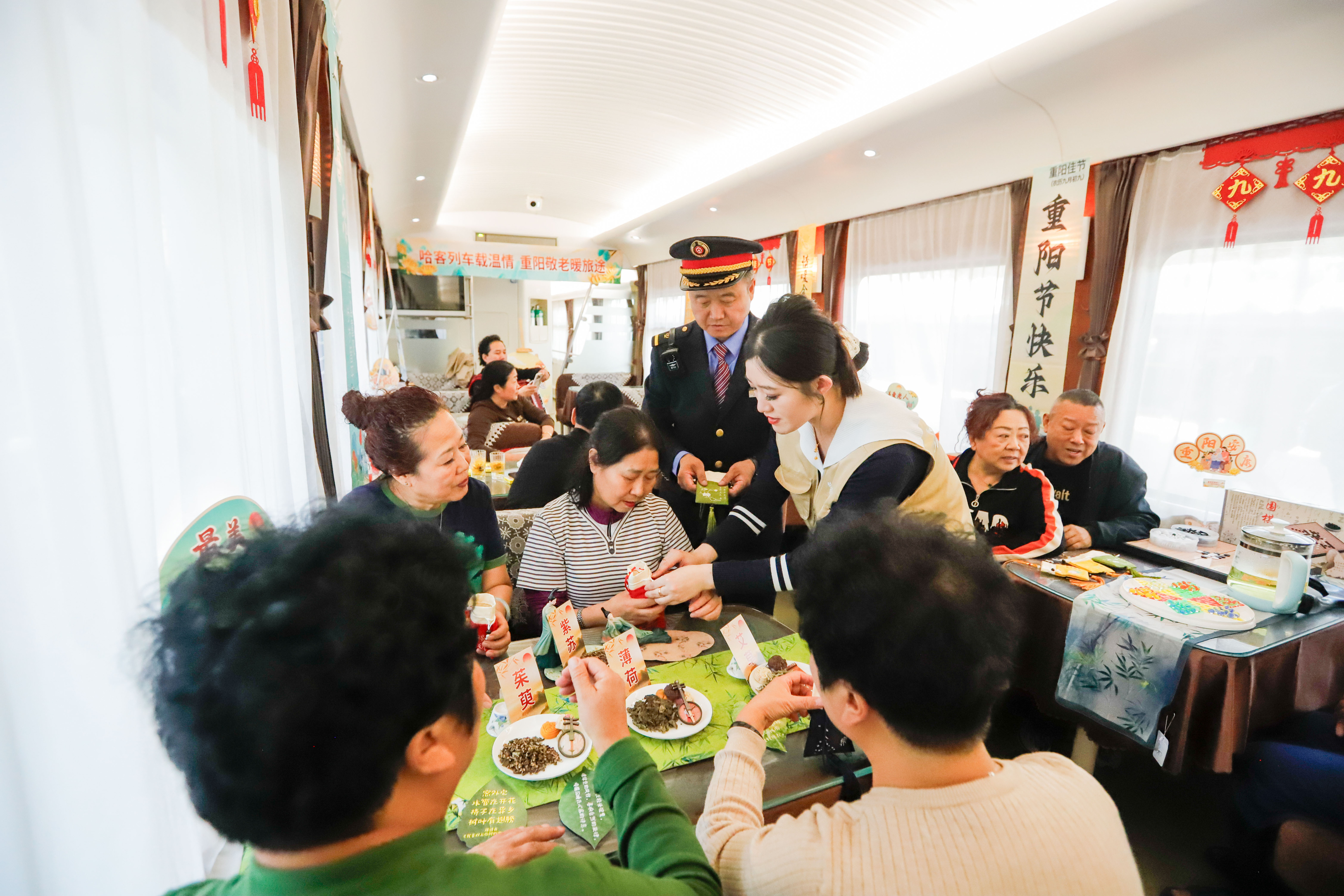 10月28日,由中国铁路哈尔滨局集团有限公司担当乘务的Z114次列车餐车被精心装点成为节日舞台。工作人员精心设置了重阳主题“旅拍”场景,专业妆造师为老年旅客搭配中式服装,定制丝巾成为留念礼品。乘务员与旅客一同制作香囊、开展诗词抢答,车厢里飘散着菊花茶的清甜与重阳糕的软糯香气。活动尾声,工作人员还为老年旅客送上定制按摩器具,让传统节日在飞驰的车厢中焕发新的温度。