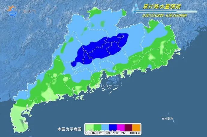 2-3日,广东省自北向南先后有一次大雨到暴雨局部大暴雨的降水过程,并伴有8级左右的雷暴大风(过程面上累积雨量40~70毫米、最大200毫米左右,小时雨量40~60毫米、最大100毫米左右);4日降雨减弱,南部市县仍有中雨局部大雨或暴雨。