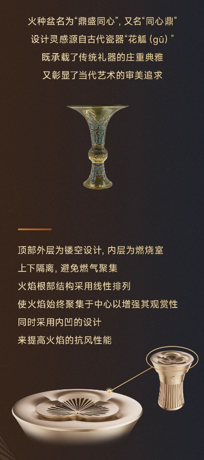 火种盆“鼎盛同心”,以丙烷为燃料,采用金属材质与高温喷漆工艺制作,设计灵感来自古代瓷器“花觚”,顶部三瓣焰口,象征三地人民心手相牵。