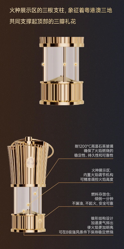 火种灯“星火筑梦”,用轻质石脑油做燃料,整体由金属与高透光石英玻璃打造,三根支柱暗合粤、港、澳三地相依。