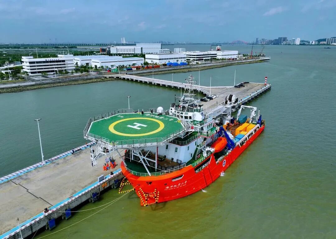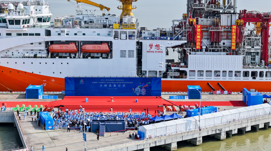 承担十五运和残特奥会深海“源火”采集任务的“海洋地质二号”科考船在广州南沙科考码头启航。图源@广州日报新花城