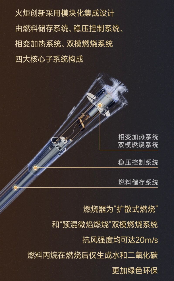 火炬“绽放”,以丙烷为燃料,采用模块化集成设计,造型神似广州“小蛮腰”,燃料是丙烷,像一簇“火树银花”绽放在手。