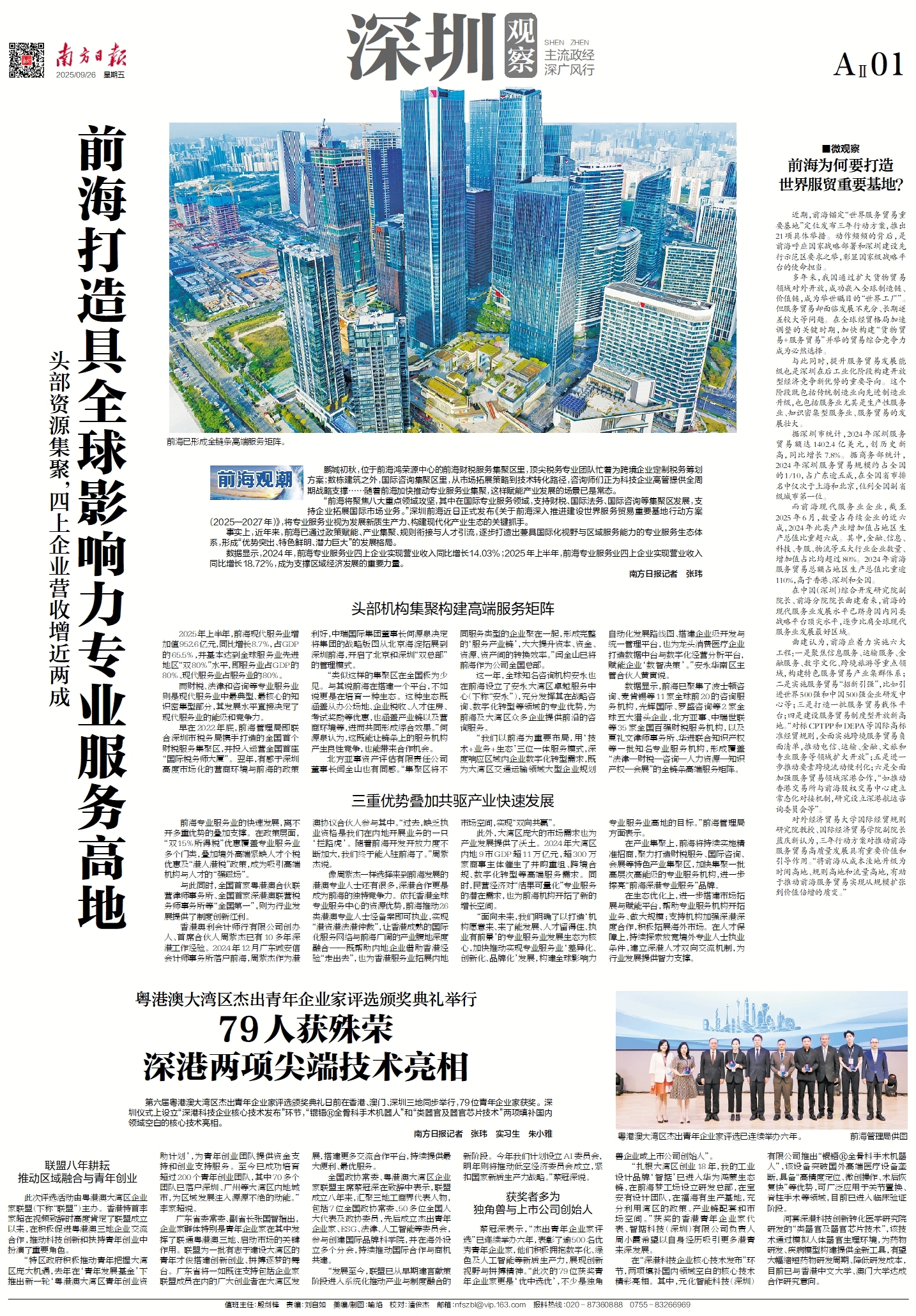 2025年上半年,前海现代服务业增加值952.6亿元,同比增长8.7%,占GDP的65.5%,并基本达到全球服务业先进地区“双80%”水平,即服务业占GDP的80%、现代服务业占服务业的80%。