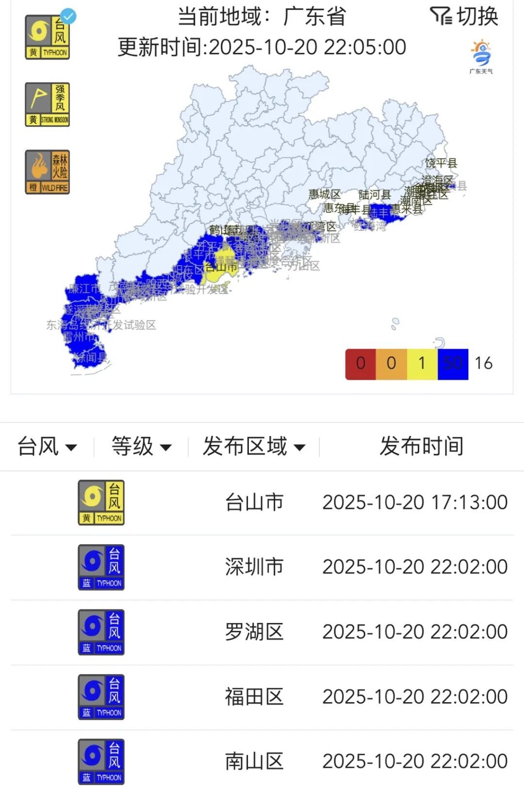 截至10月20日22时05分,广东暂只有江门台山一地发布台风“停课信号”,江门其他区域、湛江、茂名、阳江、珠海、中山、汕尾、汕头、深圳等地,有市县区台风预警信号最高发布至蓝色;惠州、揭阳、潮州,有市县区台风预警信号最高发布至白色。